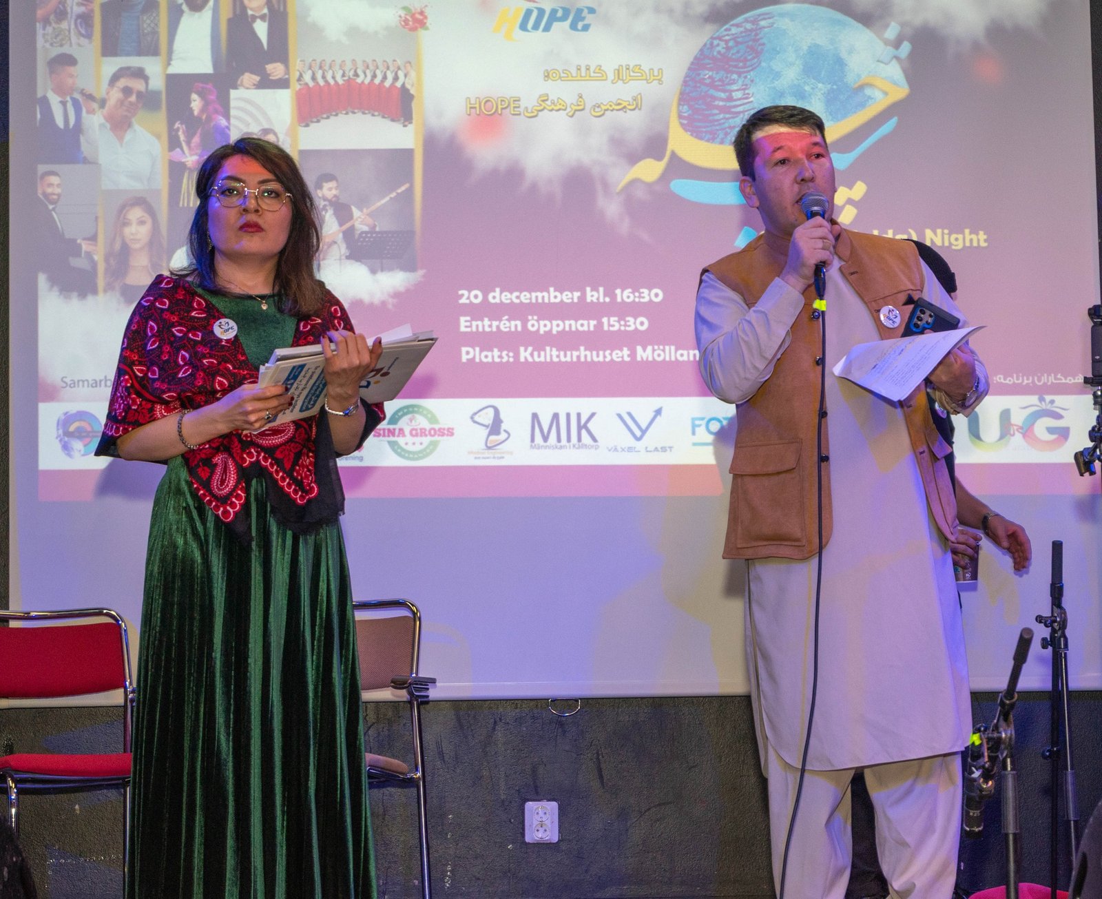 I den första delen välkomnade Sharifa Sahar, föreningens direktör, och Asif Talash, programledare för Chele Night, gästerna och deltagarna och tackade Chele Night-teamet.